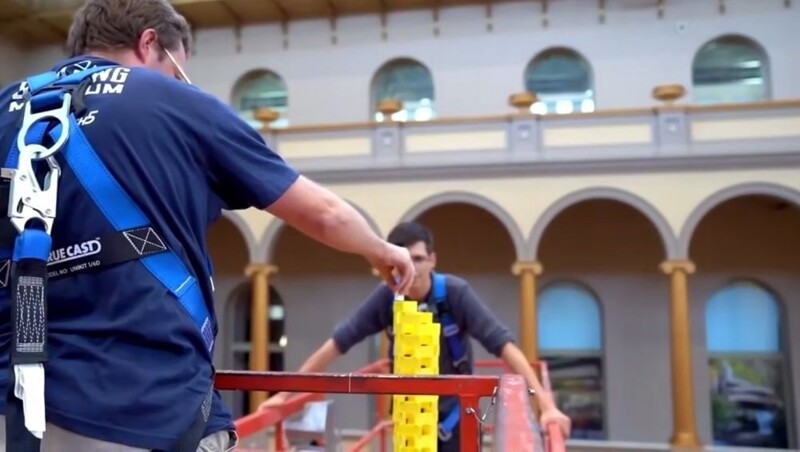 В США команда побила рекорд, построив самую высокую башню из домино. Высота конструкции составила 33 фута и 2,74 дюйма (около 10 м). Башня собиралась в Национальном строительном музее Вашингтона. Она превзошла предыдущую постройку-рекордсменку более чем на 4 дюйма (около 10 см). Затем участники кинули плюшевую белку в верхушку башни, запустив эффектное падение домино.