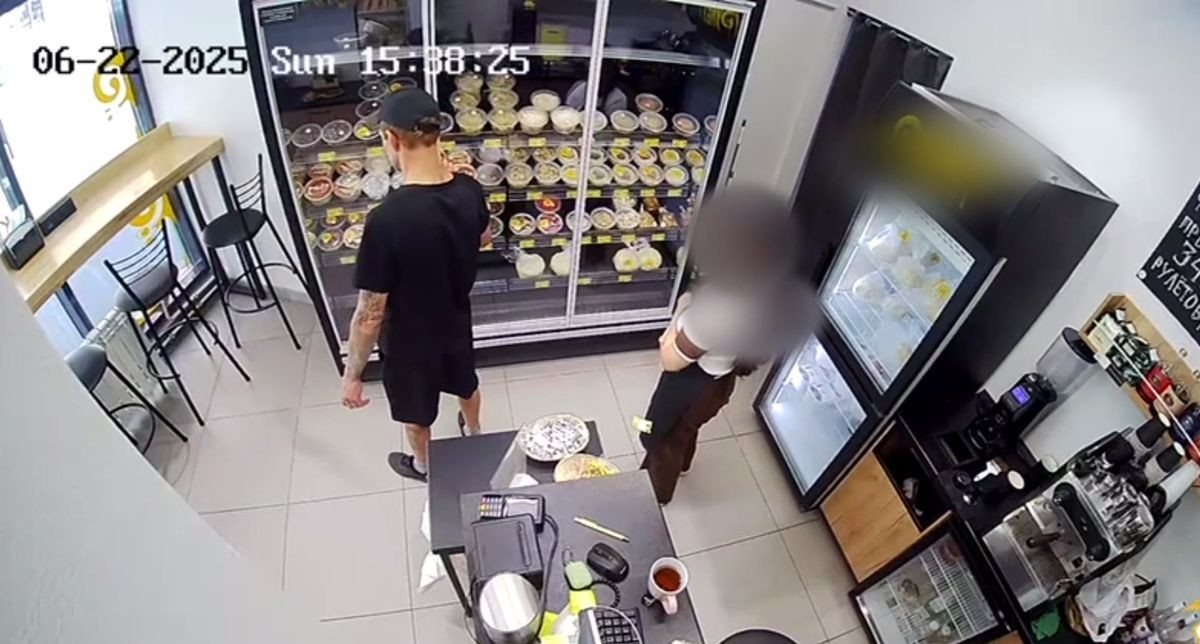 В торговый зал вошел мужчина, спокойно проследовав к витрине с десертами, он взял несколько упаковок и направился к выходу, минуя кассу.
