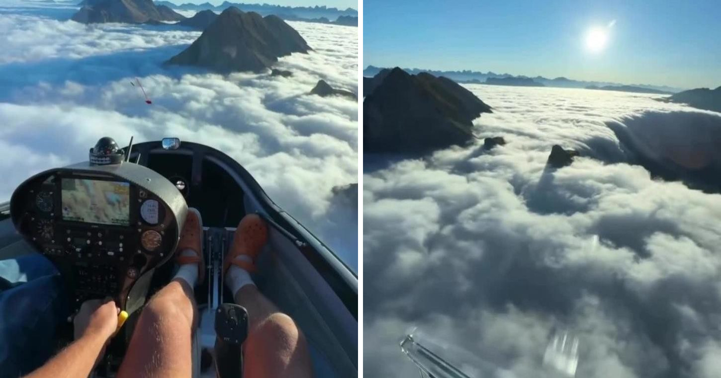 Пролетая над горами, он продемонстрировал, как облака медленно «стекают» вниз по склонам, напоминая водопад. Зрелище завораживает и создаёт иллюзию, будто сами облака падают с небес.