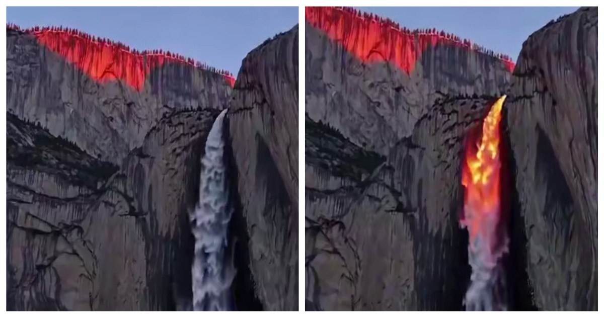 Лучи закатного солнца на короткое время освещают падающий поток воды, создавая эффект, словно сверху льётся раскалённая лава или расплавленный металл.