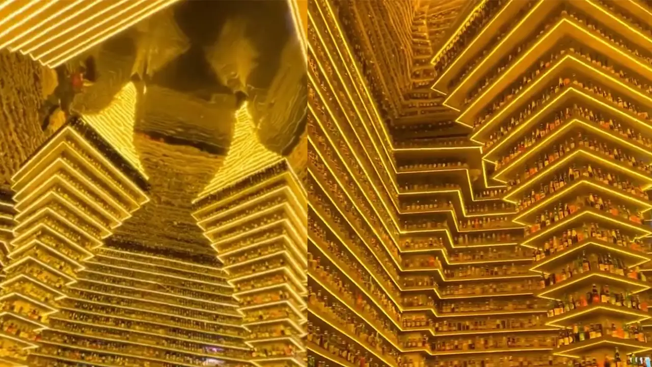 Особое впечатление производят витрины с коллекцией бутылок. Каждая золотая полка оборудована дополнительной подсветкой, которая превращает обычные емкости в драгоценные экспонаты. Это место доказывает, что даже привычные вещи можно предстать в совершенно новом свете, если подойти к их презентации с фантазией и размахом.