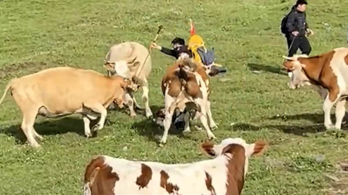 Инцидент произошел в Синьчжоу. На кадрах видно, как одна корова нападает на мужчину, затем к ней присоединяется остальное стадо. Мужчина получил синяки и небольшие переломы ребер.
