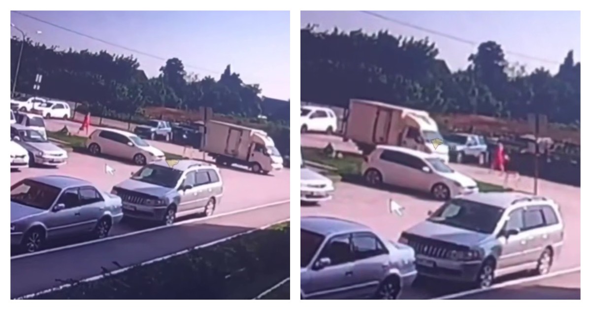 Камера видеонаблюдения зафиксировала, как небольшой грузовичок едет задом по парковке, мимо идет светловолосая девушка в красном платье и сумочкой. Оказалось в машине никого не было, авто катилось без водителя.