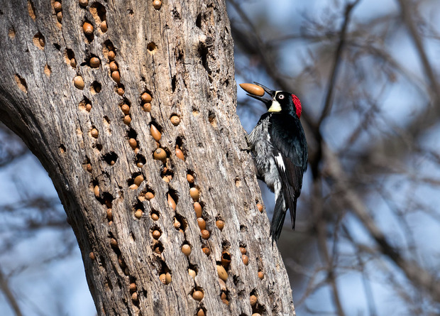 Кстати, о кладовых. Это визитная карточка желудёвых дятлов. Представьте: огромное старое дерево, в котором выдолблены десятки тысяч маленьких дырочек, и в каждой дырочке спрятан жёлудь. Самые большие деревья насчитывают до 60 000 желудей! Настоящий ад для трипофоба. Чтобы выдолбить одно такое отверстие, у дятла уходит до 20 минут. Кланы птиц поколениями долбят дырочки на своих деревьях!