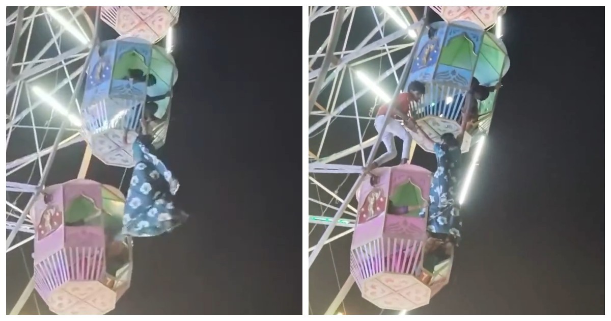 Спасать испуганную даму бросился случайный прохожий — он забрался по металлическим прутьям колеса и помог ей забраться в соседнюю кабинку.