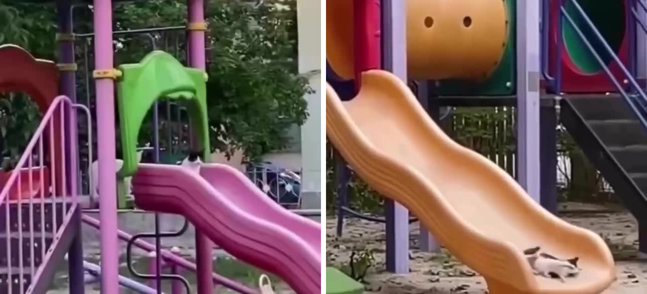 В одном из городских парков заметили пушистого посетителя, который в отсутствие людей тайком любит кататься с детской горки.