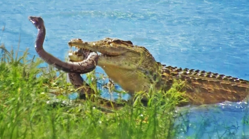 Туристы стали свидетелями схватки крокодила и питона. В начале видео крокодил подплывает к берегу и хватает питона. Тот отчаянно вырывается, но справиться с более крупным хищником ему не под силу. Поединок продолжается больше минуты, но ее исход кажется предрешенным с самого начала.