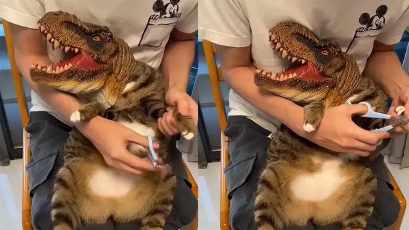 Хуже, чем мытье кота, только сеанс кошачьего маникюра. Если вы хоть раз пытались провести эту процедуру, вы точно знаете, какой небезопасной для нервов и рук она может быть. Но способы спастись от царапин все-таки есть. Например, хозяин котофея из этого видео надел на него резиновую маску динозавра.