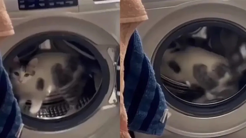 Котейка решил, что стиральная машина — отличный, а главное, бесплатный, тренажер для поддержания формы. Кот залез внутрь стиральной машины и устроил пробежку с азартом пухлого хомяка в колесе.