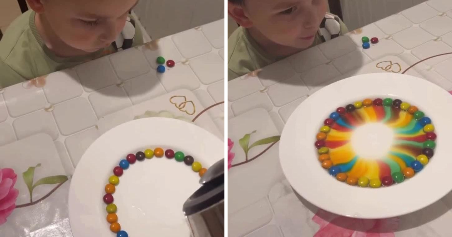Мама поделилась с сыном простым экспериментом: нужно разложить разноцветные конфеты Skittles по кругу на тарелке, а затем аккуратно влить горячую воду в центр. Через несколько секунд цвета начинают медленно вытекать из конфет, образуя яркий радужный узор, который стекается к центру.
