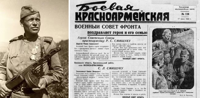 Вскоре Роману Смищуку было присвоено звание Героя Советского Союза. Золотую звезду ему вручал лично маршал Малиновский. На награждении присутствовал и сын Смищука. На момент подвига Роману было уже 44 года. Командование удовлетворило просьбу героя и позволило отцу и сыну воевать вместе в одном подразделении и вместе громить захватчиков. Вместе они прошли всю войну и благополучно вернулись домой.