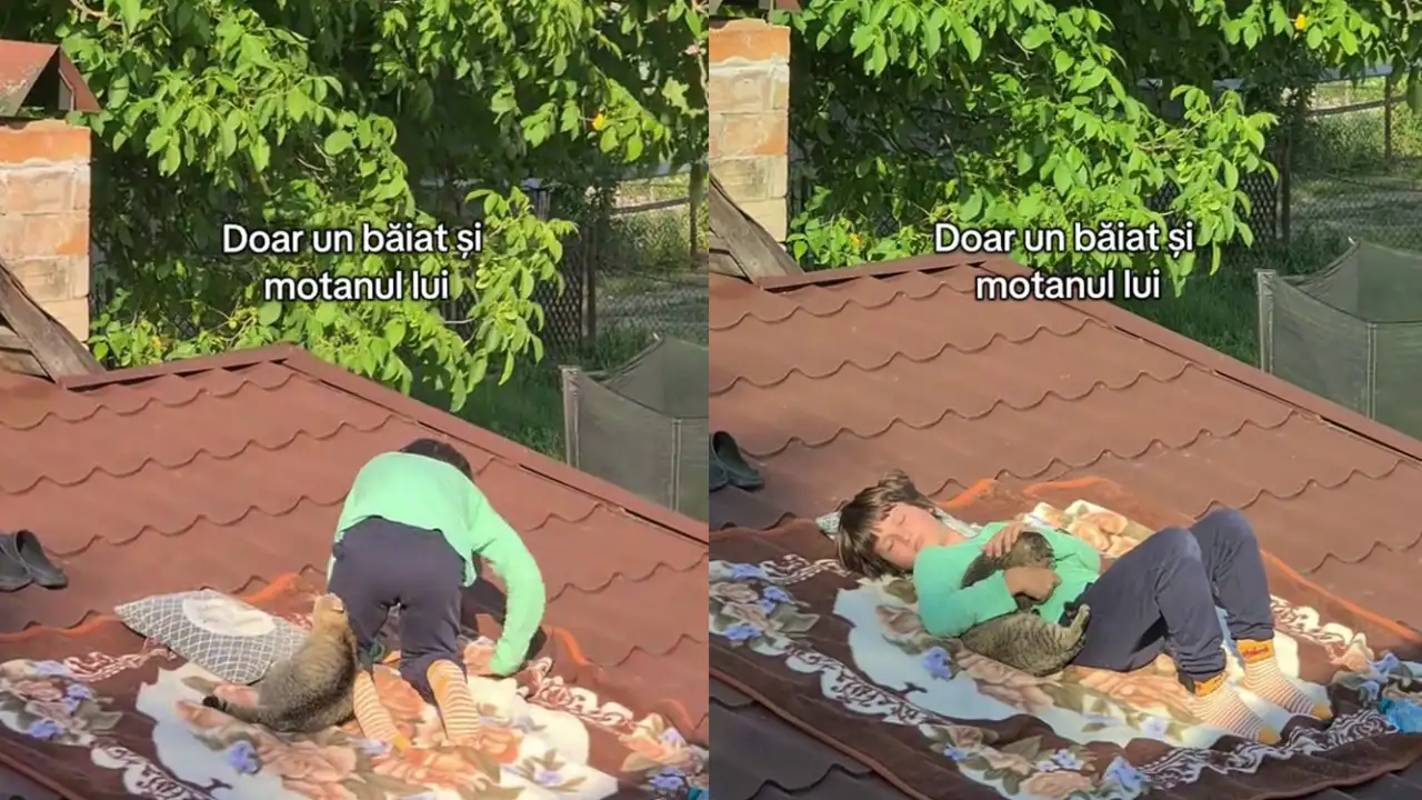 Мальчик устроил уютное место для отдыха с котиком прямо на крыше