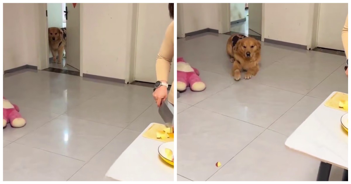 Пёс пытается добраться до куска еды, который уронила хозяйка. Минимум скрытности, максимум милоты.