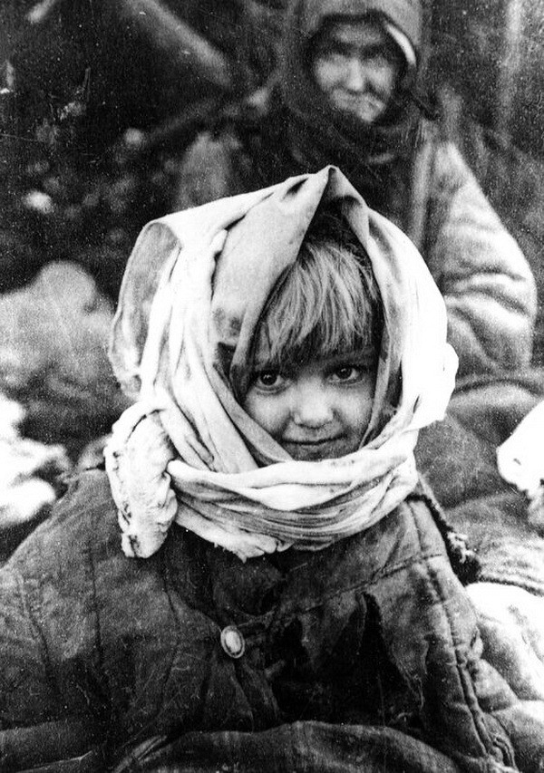 Узница концлагеря «Озаричи» в Белорусской ССР. Из интервью, которое Вера Сергеевна Солонович (в девичестве Курьян) дала корреспонденту издания Sputnik Игорю Козлову: «Немцы на танках гонялись за людьми. Все убегали куда глаза глядят. Моя мать убегала с только что родившейся сестрой на руках, а меня взял отец, бежали к лесу… Уцелевшие жители деревни укрылись на большом болоте, которое называлось Бабинец. Там я оказалась вместе с матерью, братом Женей и сестрой Олей. Вместе с нами были дед и тетка Ходосья с двумя детьми. Всю войну мы провели на этом болоте… В самом начале марта 1944 года немцы стали сильно обстреливать Бабинец. Нас выбили из леса и погнали в концлагерь «Озаричи»… Мы все были обречены: люди лежали на промерзшей земле, болели сыпным тифом, больные заражали здоровых. Нам просто повезло, что нас освободили 19 марта 1944 года, еще бы две недели, и никого в живых в лагере не осталось бы… В Озаричах я впервые в своей жизни сфотографировалась. Меня потеряли, и искать меня отправилась тетка Ходосья. Фотокорреспондента она приняла за переодетого немца, а фотоаппарат – за неведомый для нее вид оружия и решила, что нас с ней будут убивать. Она сказала фотокорреспонденту, что если он решил нас убить, то пусть быстрее, не мучает. На снимке на заднем плане виден силуэт человека – это моя тетка Ходосья… После освобождения из концлагеря нас привезли в Хойники… Нас всех сразу отправили в баню. Здание было белым – я никогда не видела до этого белых домов. Оно показалась мне неестественным. Люди долго из него не выходили. А из окон шел пар. Тетка Ходосья решила, что это душегубка и нас будут травить там газом. Всем нам она приказала, что когда мы войдем в это помещение, то должны как можно глубже вздохнуть, чтобы, умирая, не мучиться. Я так и сделала. Этот запах распаренных грязных человеческих тел остался со мной навсегда. Понимайте меня, как хотите, но когда человек не мылся годами – воняет он похуже скотины… Мать запрещала мне рассказывать, что я была в концлагере. Это было время, про которое у нас, белорусов, принято говорить «галеча». Не было ничего, жизнь начинали с нитки и иголки. Не знаю, можно ли об этом говорить и писать…»