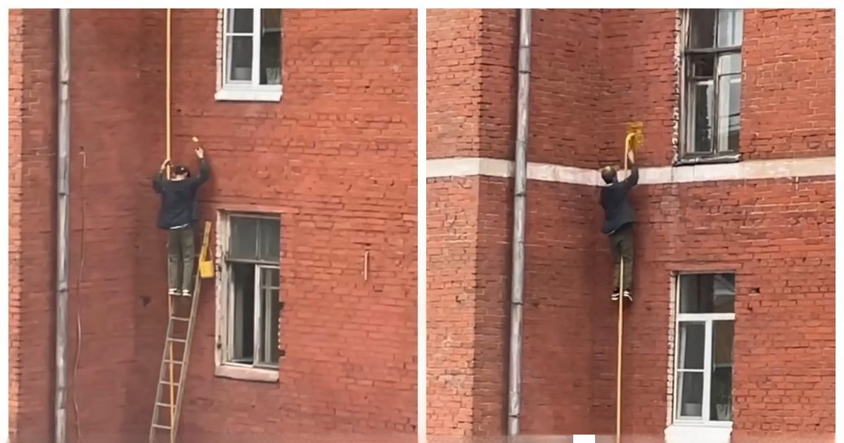 Рабочий с кисточкой взобрался на самый верх конструкции и, медленно спускаясь вниз, окрашивал её в яркий жёлтый цвет. Процесс выглядел эффектно и привлёк внимание прохожих.