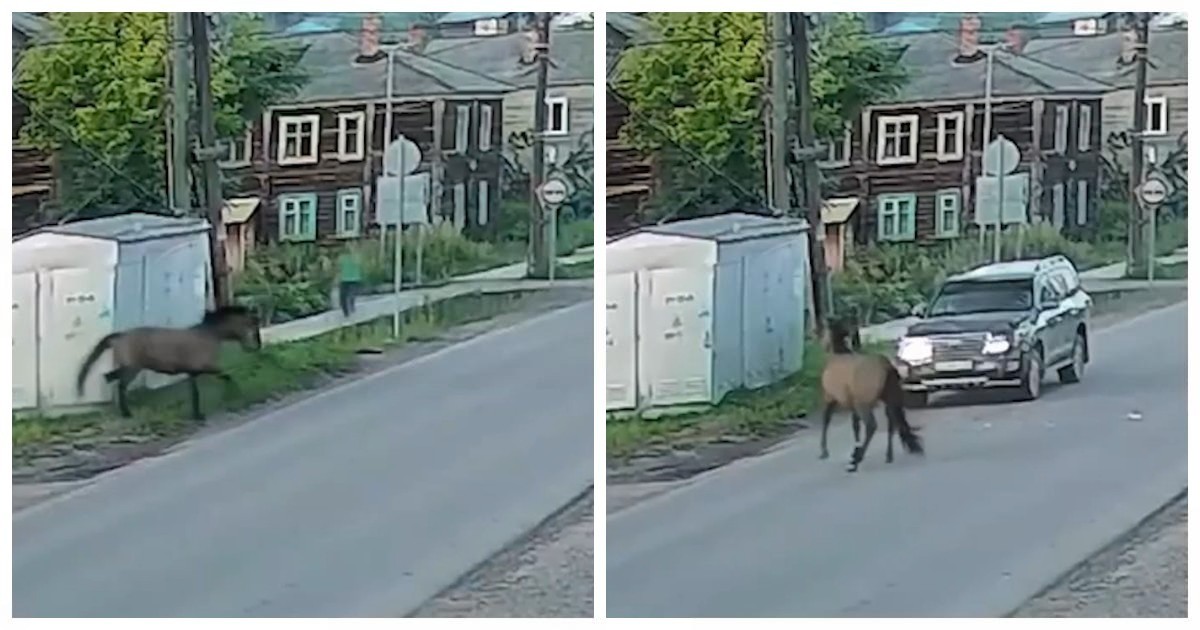 Скакун решил перебежать дорогу настолько внезапно, что угодил под «Крузак». На кадрах с места происшествия видно, как лошадь сначала неспешно бродила у дороги, затем скрылась из обзора за строением и ринулась перебегать проезжую часть. Причём животное решило развернуться на полпути и буквально забежать на движущуюся машину.