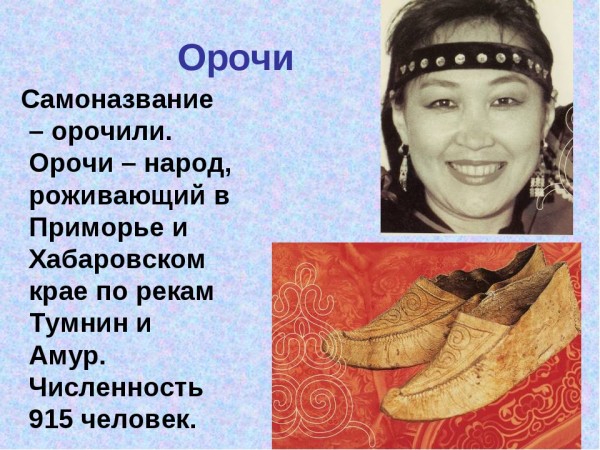 Орочи — коренной народ Дальнего Востока, язык и самобытное существование которого находятся на грани исчезновения. Вплоть до XIX столетия орочи сохраняли традиционные верования в духов природы. Верили, что земля — огромная восьминогая лосиха, а души умерших возрождаются вновь после перерождения в лунном царстве.