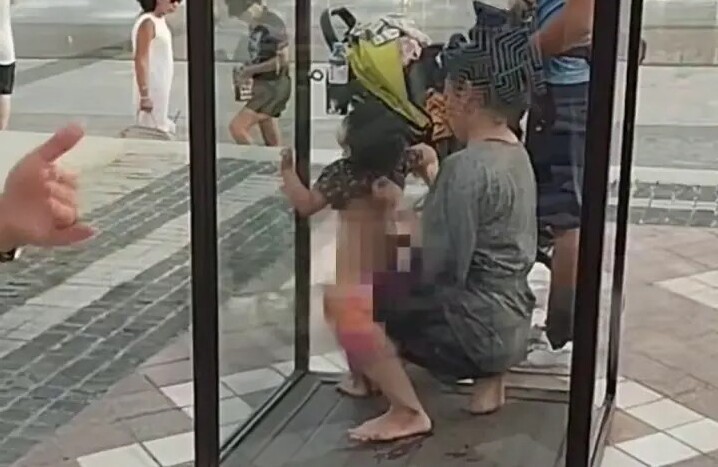 На кадрах видно, как мать на корточках переодевает ребёнка — сначала снимает шорты, после чего малыш некоторое время стоит без одежды ниже пояса. Затем женщина надевает вещи обратно и уводит его.