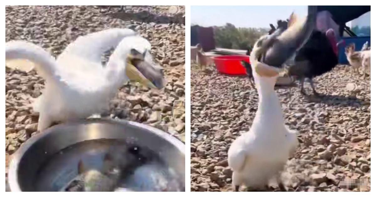 Когда птица полностью «набита», то даже не может нормально согнуться (тем более взлететь) и становится похожа на пернатого жирафа, что как раз отлично видно на этом видео.