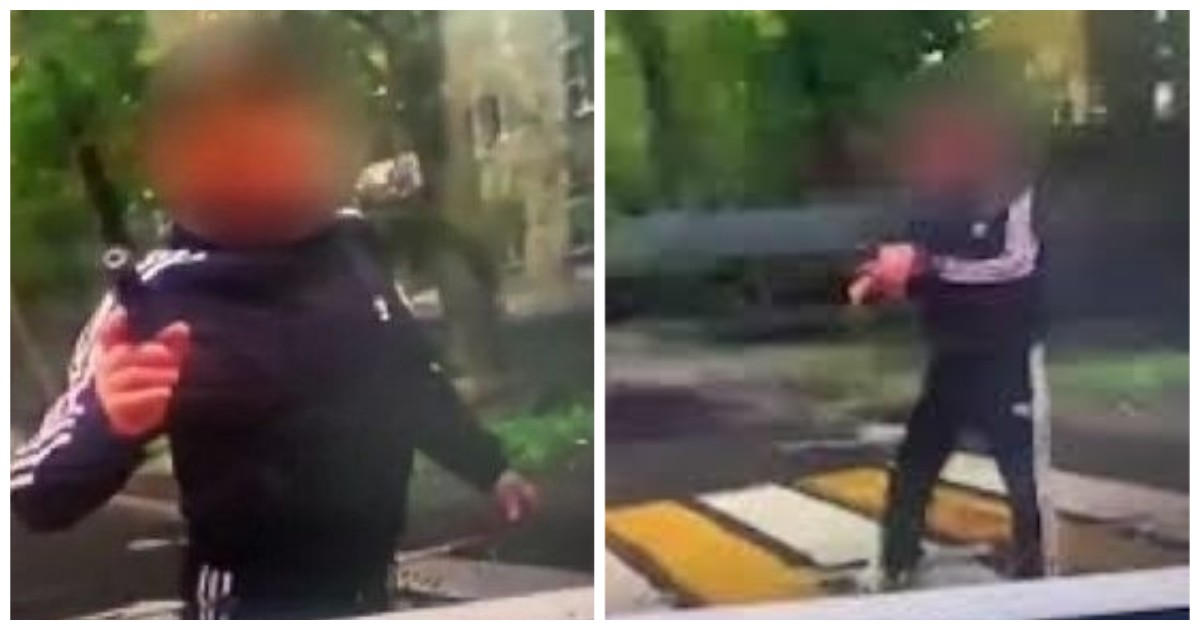 На кадрах видно, как мужчина останавливает автобус и размахивает перед ним пистолетом.