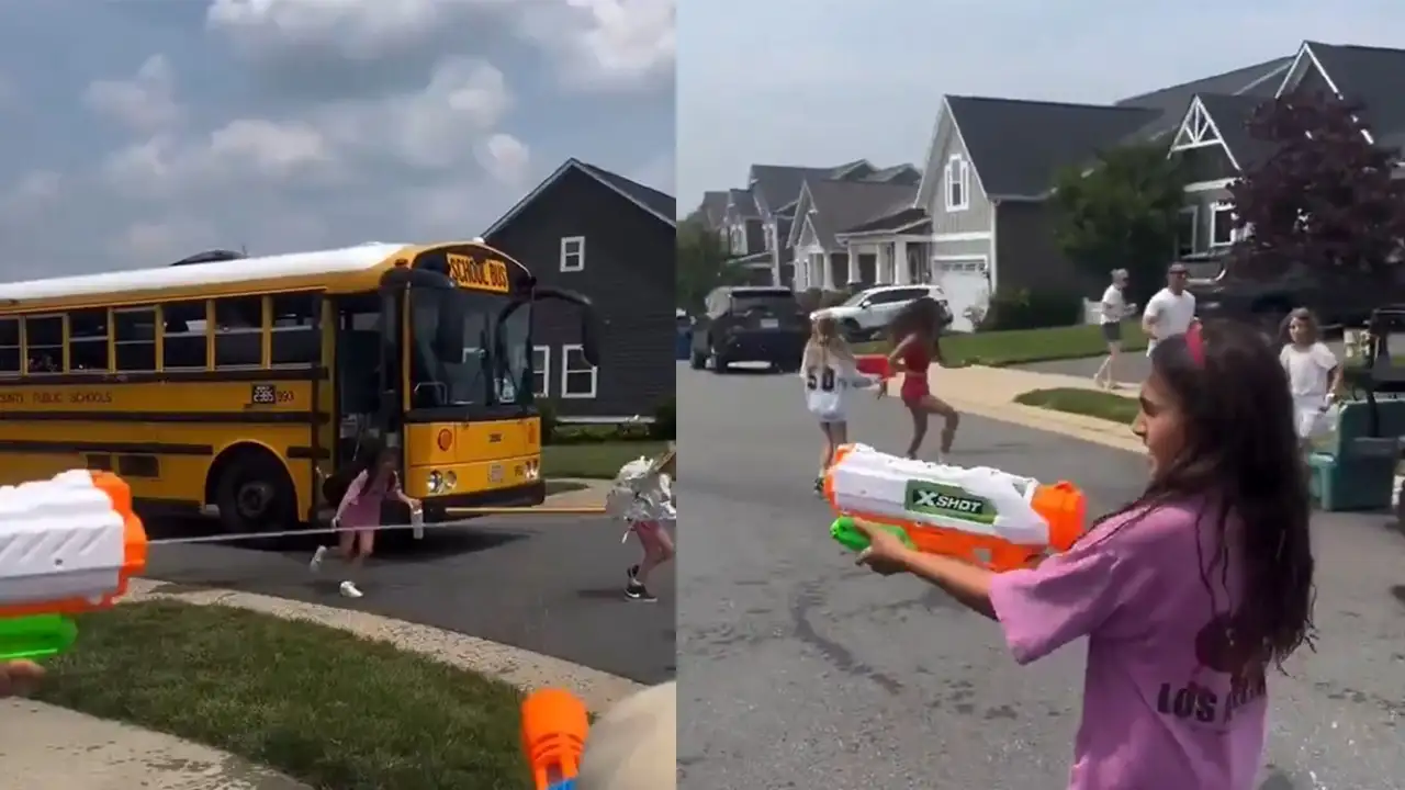 Большинство родителей встречают детей из школы, просто выходя на улицу, но мамы и папы из этого видео решили врубить фантазию на полную и встретили детей, устроив им нестандартный сюрприз — «войнушку» с водяными пистолетами. Они вооружились «до зубов» и атаковали ошарашенных школьников сразу же после того, как те вышли из автобуса.