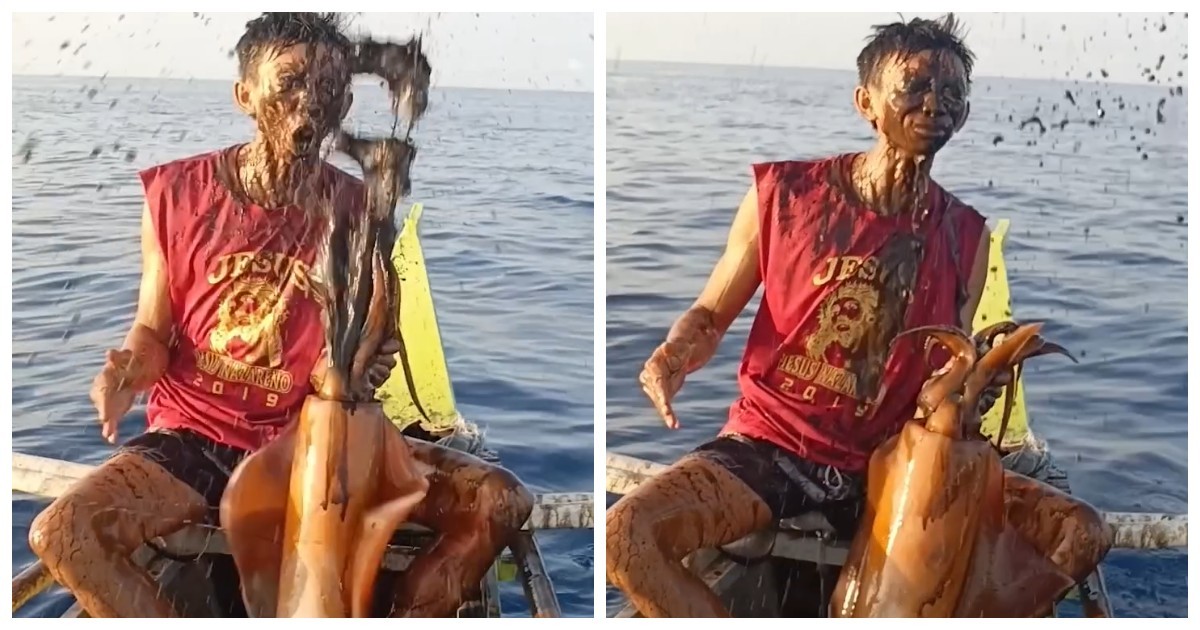 На Филиппинах рыбак поймал крупного кальмара, который напоследок выпустил в него струю чернил, сделав завершение рыбалки необычным и забавным.
