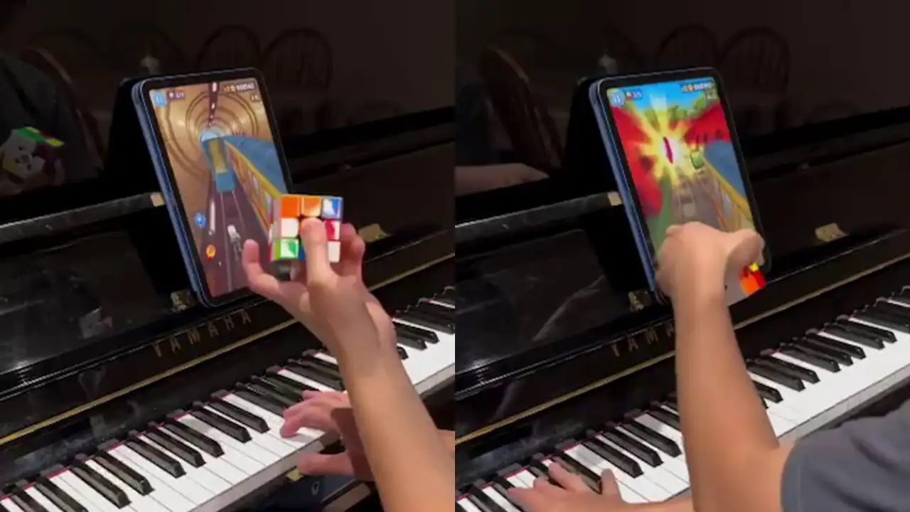 Молодой человек одновременно играет виртуозную мелодию на пианино, ловко собирает сложный кубик Рубика и, при этом, не отрываясь, увлеченно играет в популярную мобильную игру Subway Surfers на своем планшете.