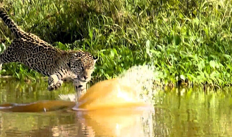 Свидетелями столкновения хищников стали члены туристической группы Итало Гарсии Алвеса. Он рассказал, что заметил ягуара, затаившегося на дереве, когда исследовал джунгли. Мужчине пришлось просидеть в засаде четыре часа и 11 минут, чтобы увидеть, как дикая кошка нападет на проплывающего мимо аллигатора. Этот момент попал на видео.