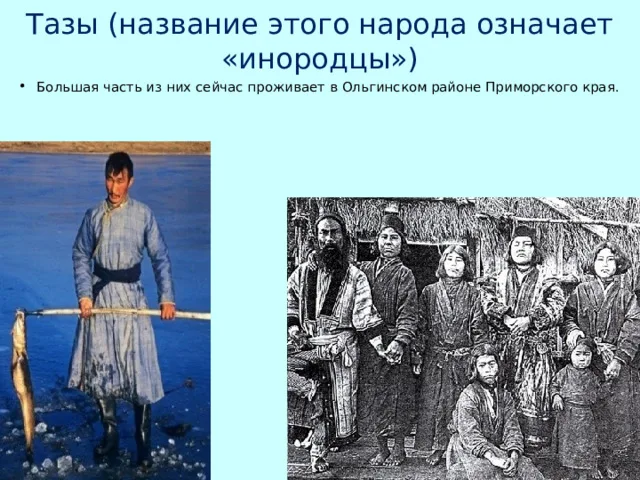 У китайцев существовало собственное разделение по внешним признакам. Важно понимать, что тазы, скорее всего, произошли от маньчжуров, которые жили на севере Китая. Среди остального населения они считались инородцами. Их название прямо указывает на привязку к определенной территории, где они считались аборигенами. Для этих аборигенов характерным был более бледный цвет кожи. Поэтому их даже называли «рыбокожими».