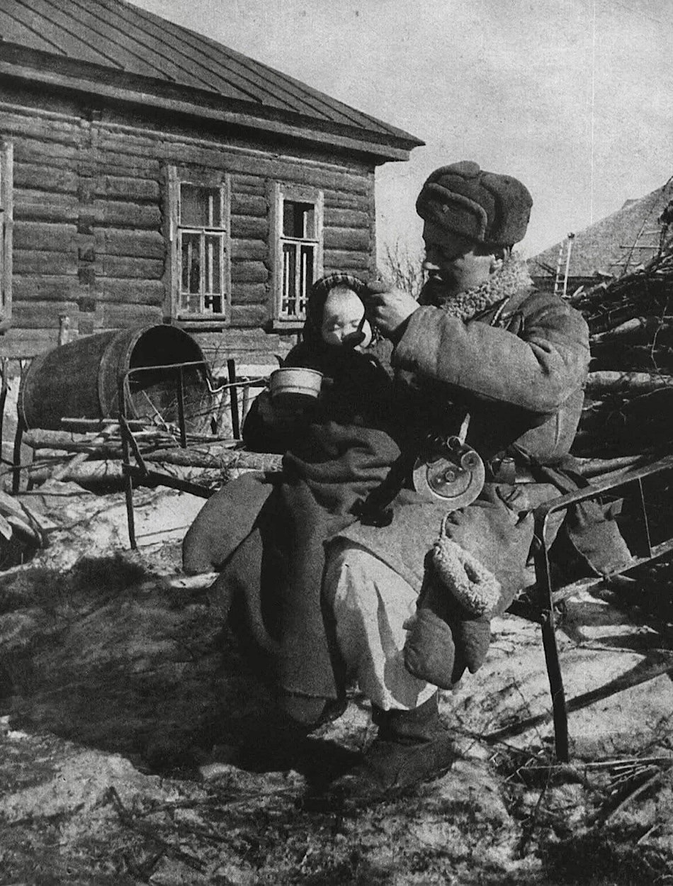 Теперь уголь и пепел лежат на пути. Две-три уцелевшие избы среди груды развалин, кирпичных труб, обгоревших кроватей — это деревня. Хозяева уцелевших домов приютили у себя погоревших соседей, — всюду, на печи, на скамьях лежат люди, виднеются детские головки. Да не только соседям дают кров хозяева. Часто слышится стук в дверь, и на вопрос «кто?» звучит ответ: