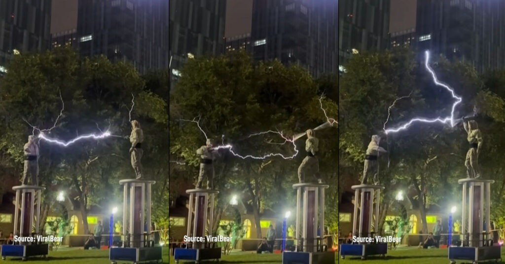 На пивном фестивале в Циндао зрители стали свидетелями необычного зрелища — два танцора в специальных защитных костюмах манипулировали тесла-катушками, передавая между собой электрические разряды. Мощные всплески тока превращались в яркие молнии и озаряли все вокруг.