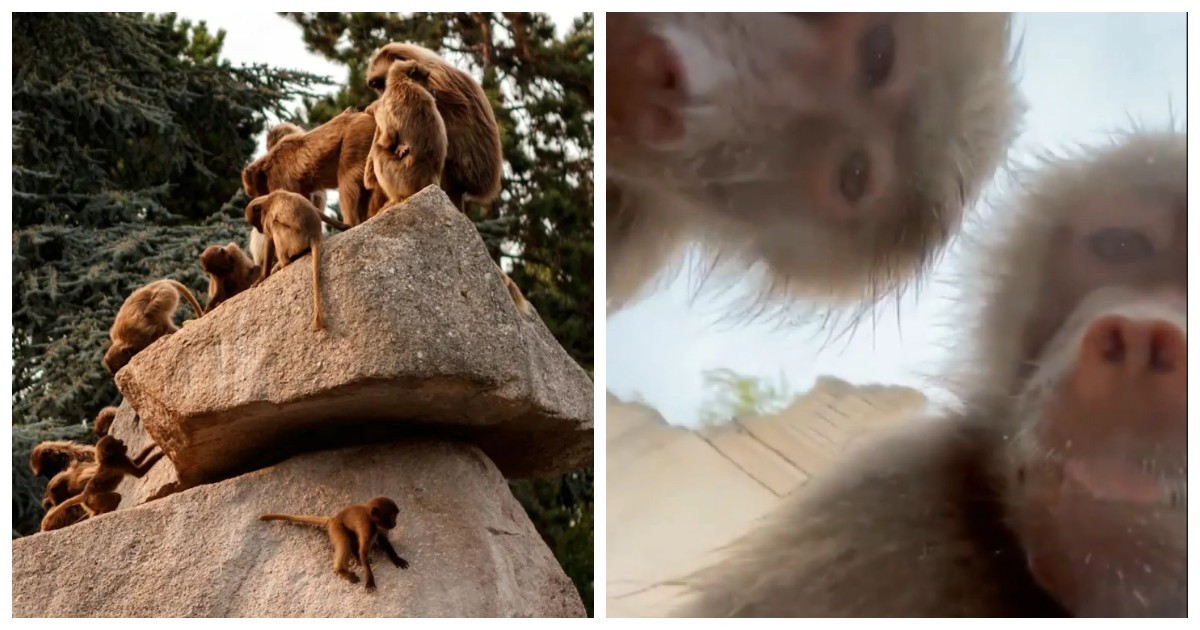 Гаджет не разбился при этом, однако на происшествие быстро отреагировали здешние приматы. Стая бабуинов подбежала к смартфону, лежащему на земле, и один из них схватил телефон в руки.