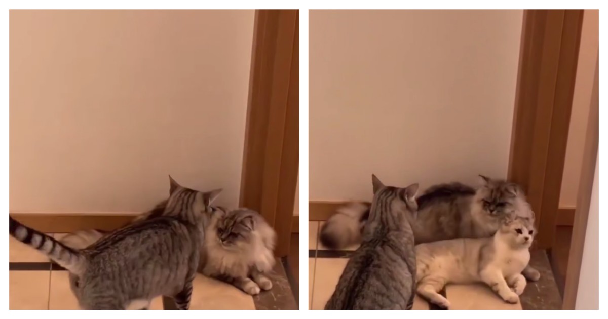 У кошачьего семейства из этого видео есть свой собственный дипломат — пушистый малыш, который не терпит семейных разборок. Как только родители начинают переглядываться с опасным блеском в глазах, маленький миротворец решительно встает между ними. Тактика этой маленькой кошечки проста — она трется мордочкой о разгневанные морды родителей, переключая внимание с конфликта на нежные прикосновения.