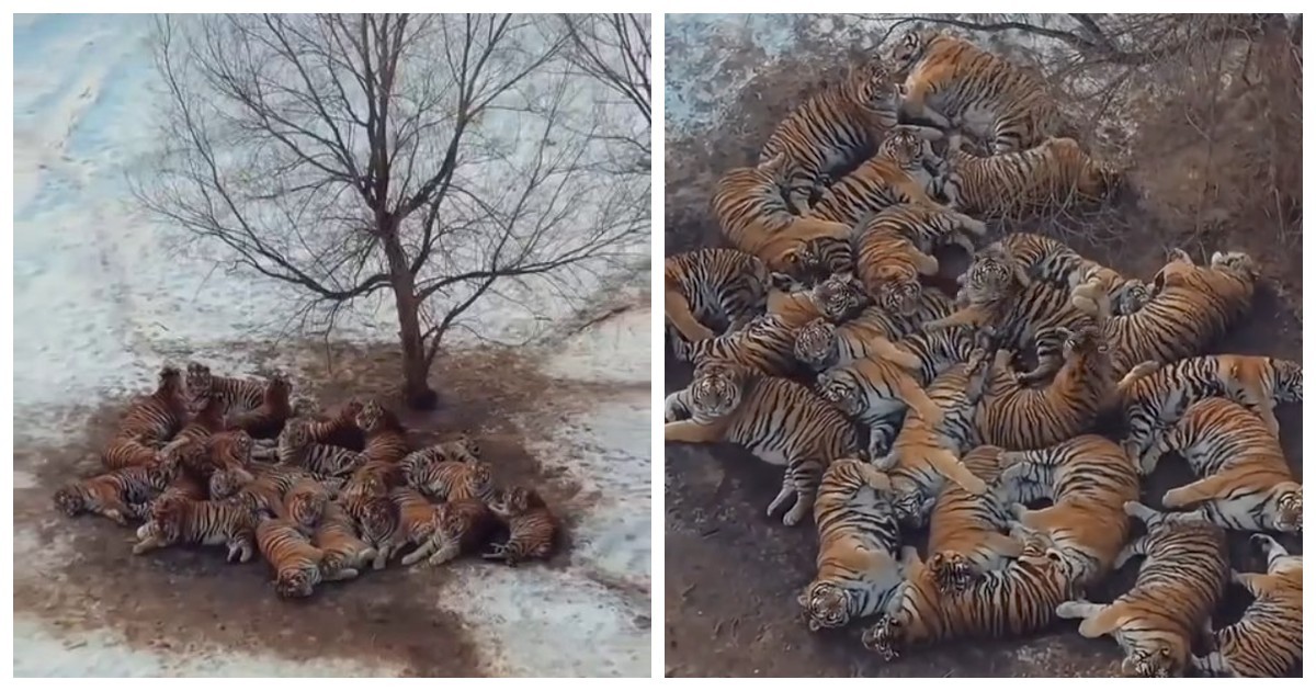 В китайском Харбине находится крупнейший тигриный заповедник в мире — здесь живут десятки амурских тигров. А так они ложатся кучей в мороз, чтобы согреться.