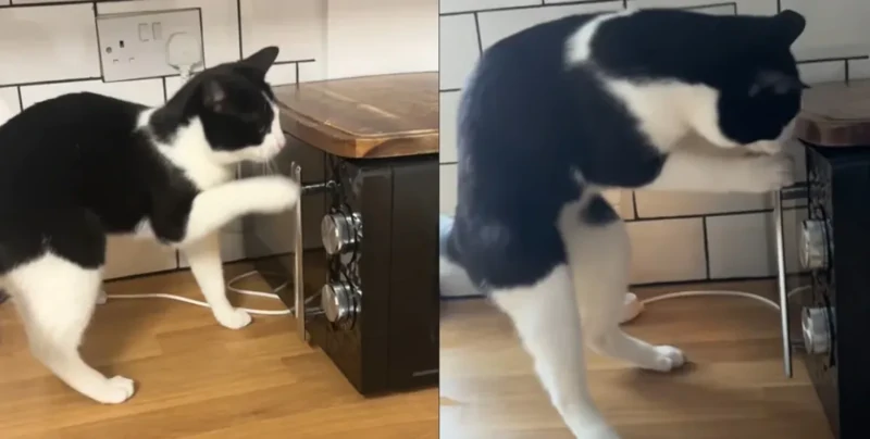 «Вы когда-нибудь видели, как кошка открывает микроволновку?» — гласит подпись к видео. Автор спешит остановить четвероногого кулинара и вытащить его из устройства, прежде чем он залазет слишком далеко.