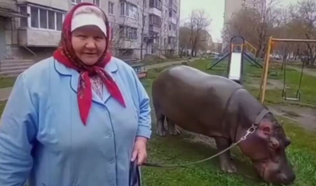 Бабушка завезла себе огромного зверя и даже ездит на нём верхом до магазина. Малыша зовут Булька. Он хорошо себя чувствует в маленькой квартире и спокойно щиплет травку во дворе.