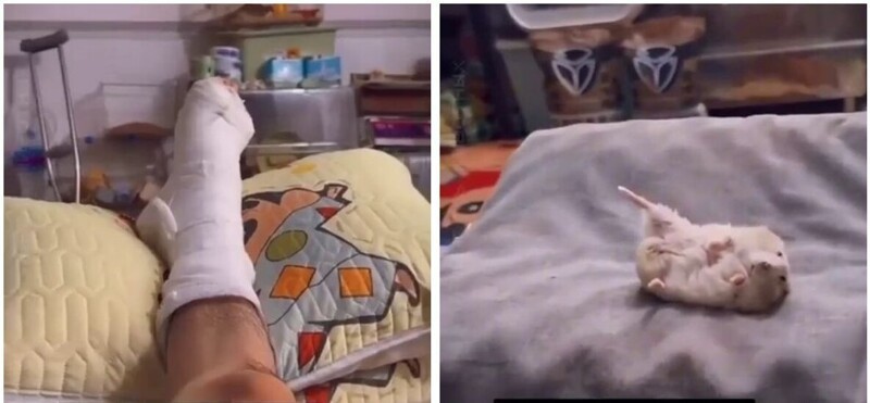 Парень, получив перелом ноги, вынужден проводить время в лежачем положении, в то время как его домашний хомяк комично имитирует его состояние.