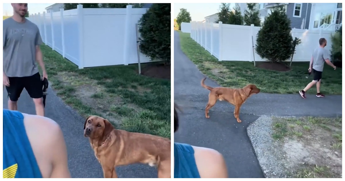 Пёс отправился гулять со своими хозяевами. Во время прогулки перед питомцем встал сложный выбор: пойти за хозяйкой или хозяином.