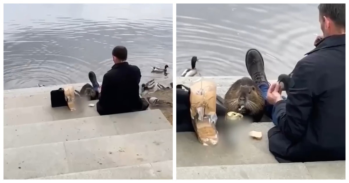 В Праге к отдыхающему на набережной мужчине присоединились голуби и бобр. А пражанин оказался не прочь разделить свой ужин вместе с грызуном.