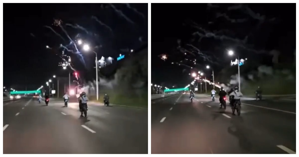 На кадрах, попавших в соцсети, видно, как один из пит-байков едет с включённым фейерверком, который выстреливает прямо из рулевой части. Огонь и искры сопровождают движение по оживлённой магистрали, создавая угрозу для других участников дорожного движения