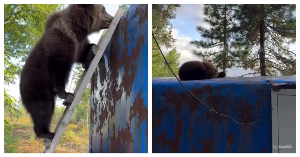 Мужчина снял на видео медведя, который вышел к городку вахтовиков. Зверь подобрался к жилому вагончику и воспользовался деревянной лестницей, чтобы забраться на крышу. Хищник проигнорировал внимание оператора, спокойно устроился на крыше и уснул.