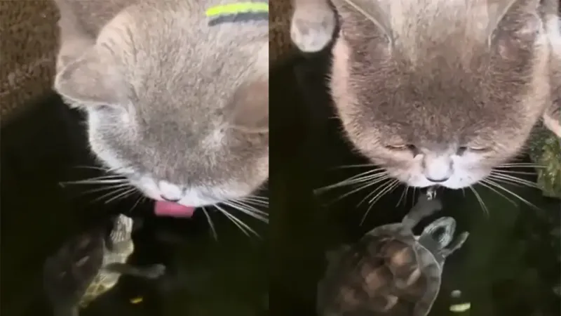 Без малейшего стеснения он припал к водоему, превратив домик черепахи в свою поилку, пока хозяйка территории негодовала.