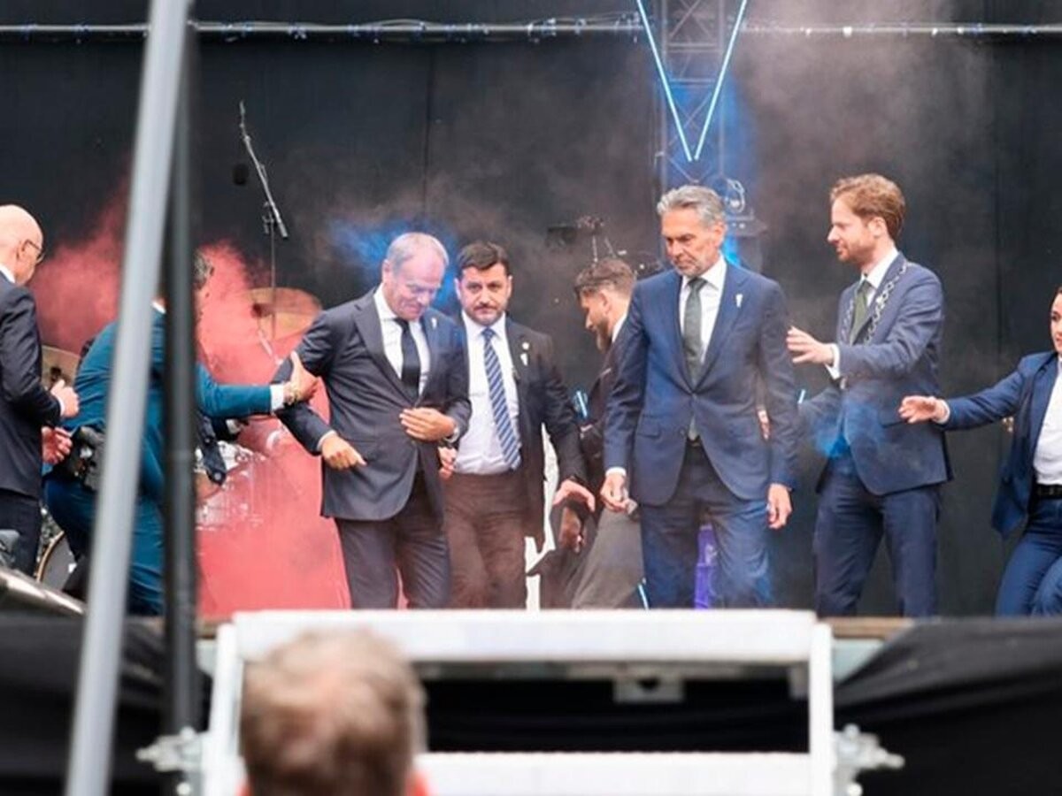 Кто-то из толпы выбросил дымовую шашку на сцену, где находились премьеры Польши и Нидерландов. Она упала прямо под ноги Туску.