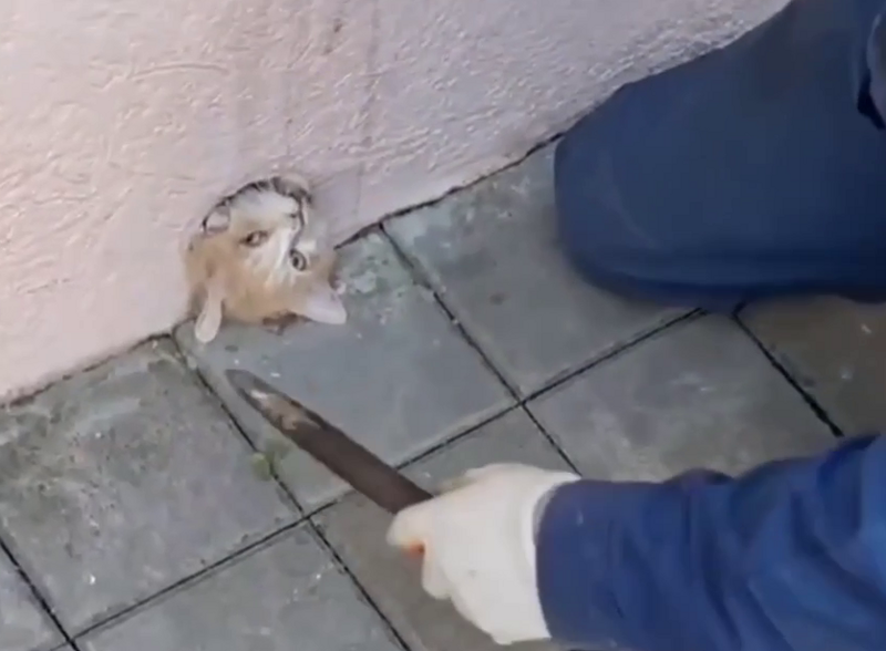Кот застрял в отверстии для слива дождевой воды и жалобно мяукал