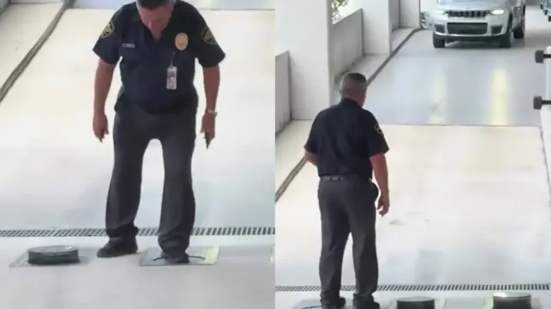 Охранник на парковке безуспешно пытается решить головоломку с выезжающими столбиками, активация одного из которых вызывает цепную реакцию.