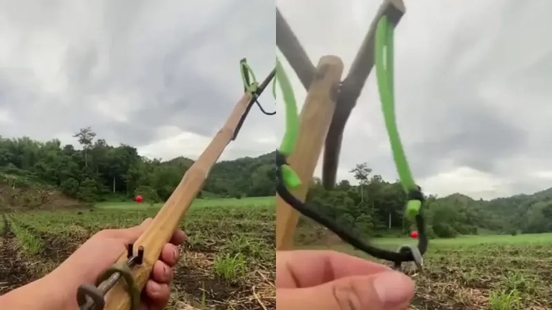Видео демонстрирует мужчину после 30 лет, увлеченно показывающего самодельную рогатку, стреляющую гвоздями, и принцип её работы на воздушном шарике.