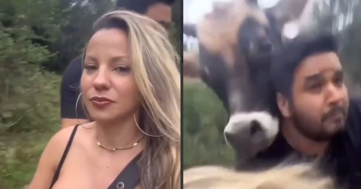 Влюбленные остановились, чтобы запечатлеть момент на фоне пейзажа, но их фотосессию прервало внезапное появление коровы.