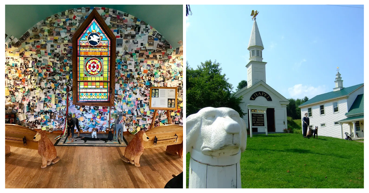 При входе в часовню человека буквально заливает свет, исходящий от витражей, на которых изображены собаки, украшенные резьбой по дереву. Внутренние стены увешаны рукописными заметками и фотографиями собак и других животных, которые ушли из жизни, а на столах выставлены угощения для посетителей.
