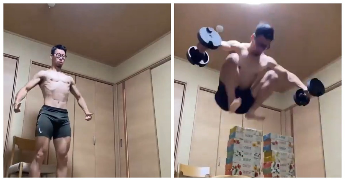 Мужчина выполняет прыжки на разные уровни, держа в руках гантели по 8 кг — Интересные новости