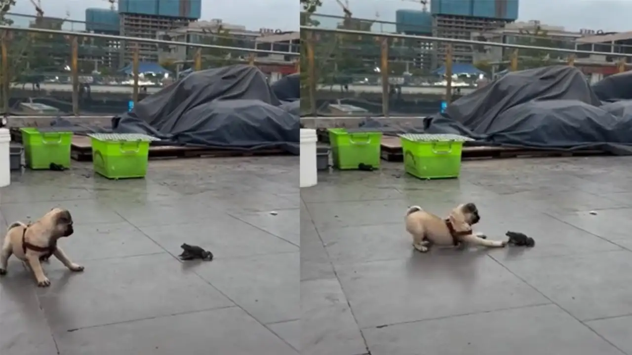 Страшно, очень страшно: мопс познакомился с жабой — Интересные новости